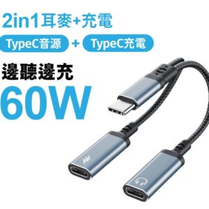 TypeC 1轉2耳麥+60W充電轉接線10CM