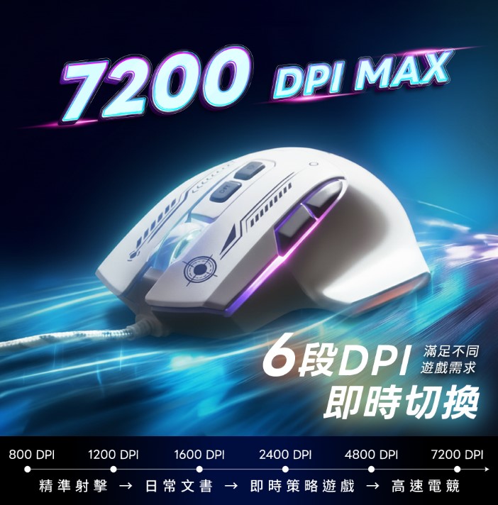 ‧ 六段DPI即時切換-800/1200/1600/2400/4800/7200 DPI,滿足不同遊戲的靈敏度需求