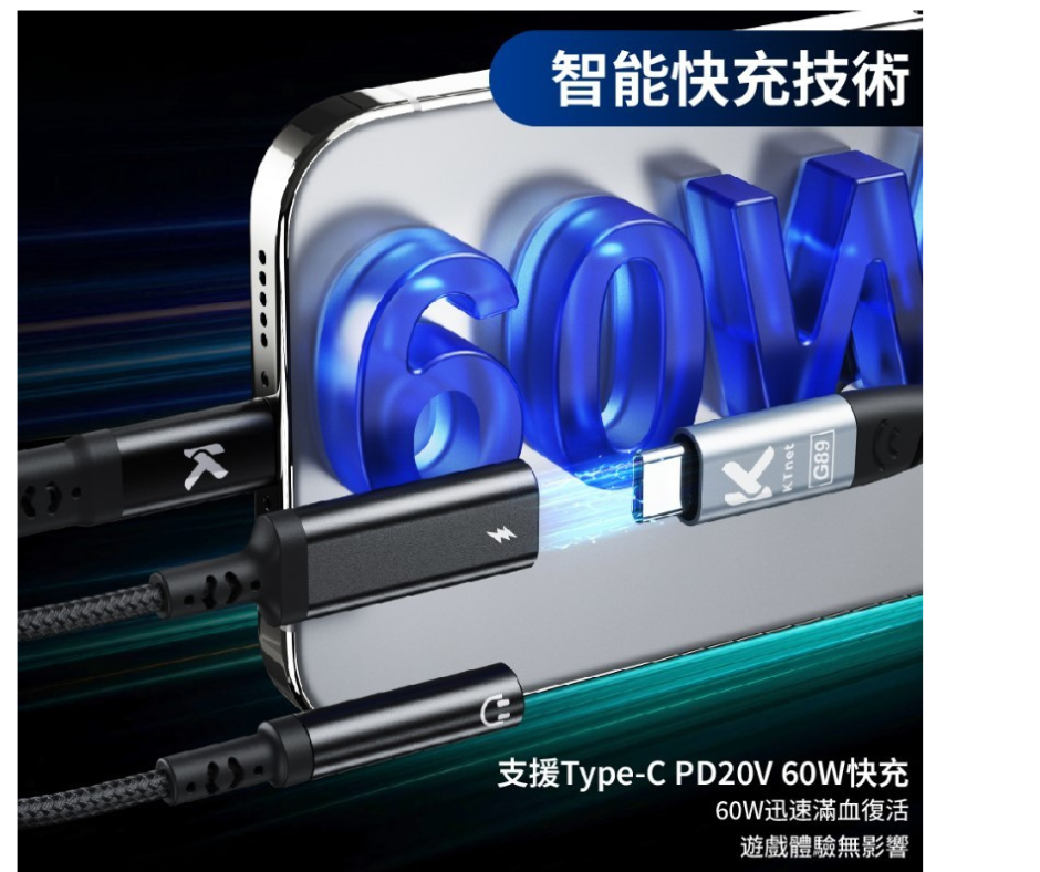 GT1Plus Type-C轉3.5 2合1音源轉接充電線60W 10CM