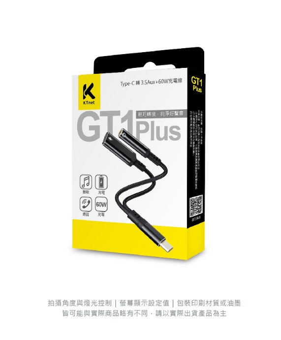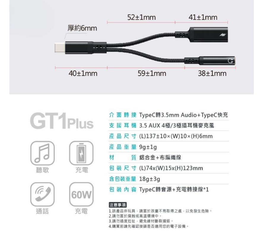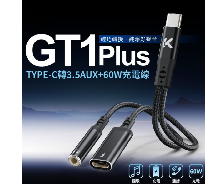 ◆產品名稱:GT1Plus Type-C轉3.5 2合1音源轉接充電線60W 10CM