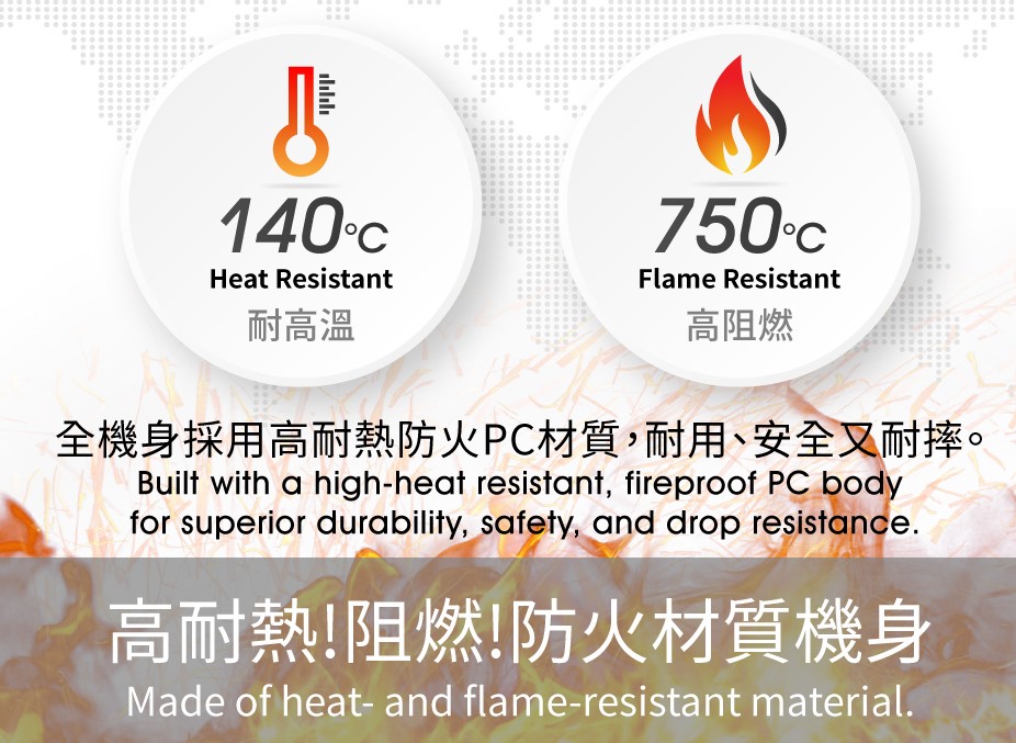 強化用電安全,全機身採用高耐熱防火PC材質,可耐高溫達140°C,750°C高阻燃,耐用、安全又耐摔。
